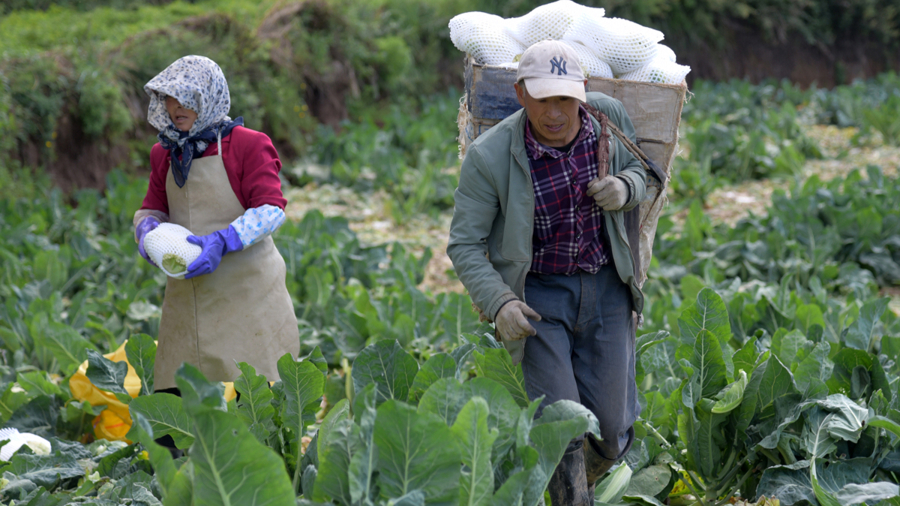 甘肃榆中县马坡乡上庄村,村民使用背篼将采摘的散花菜背出菜地。\n | 新华社发